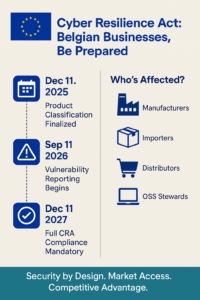 The Cyber Resilience Act represents both a compliance obligation and a strategic opportunity for Belgian businesses. Organizations that begin preparation now can spread costs over time, influence product development cycles effectively, and position themselves advantageously in an increasingly security-conscious marketplace.